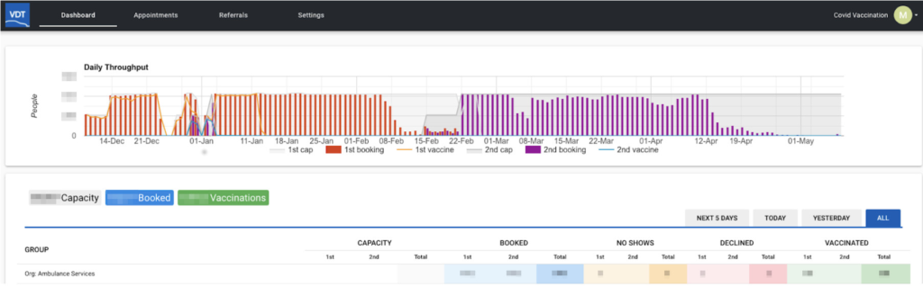The service provides the tools for the vaccination centres to set up their booking schedule including limiting time slots to particular employees or groups, monitor engagement and support a call centre to assist referrals. It also makes accurate data reporting simple.